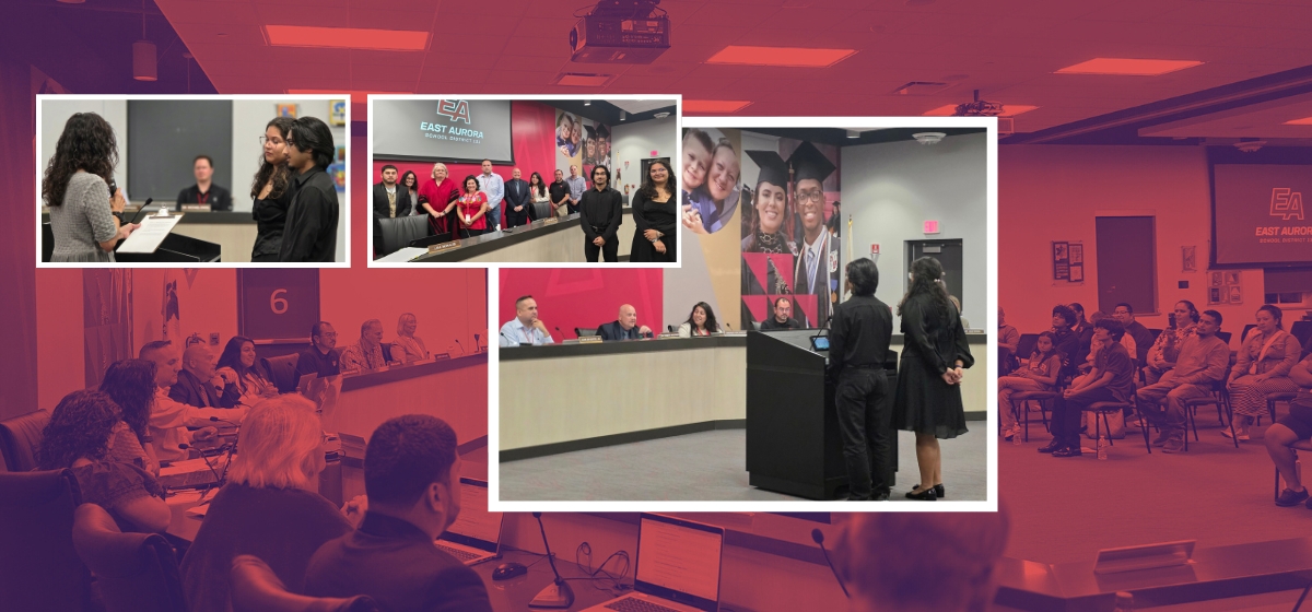 En la reunión de la Junta de Educación del 15 de septiembre de 2025, el Distrito Escolar 131 de East Aurora dio la bienvenida con orgullo a Ziyaan Laliwala y Elizabeth Corral-Moreno como los nuevos Miembros Estudiantiles de la Junta de Educación para el año escolar 2025–2026. Ambos estudiantes tomaron el juramento de cargo según lo requerido por la Asociación de Juntas Escolares de Illinois (IASB).